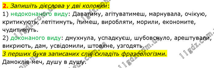Запишіть дієслова у дві колонки: 1) недоконаного виду: Даватиму, агітуватимеш, марнувала, очікую, критикують, летітимуть, ітимеш, виробляти, морили, економите, чудитимуть. 2) доконаного виду: дмухнула, успадкуєш, шубовснуло, арештували, викриють, дам, усвідомили, штовхне, узгодять. 3 перших букв записаних слів складіть фразеологізми. Дамоклів меч, душу в душу.
