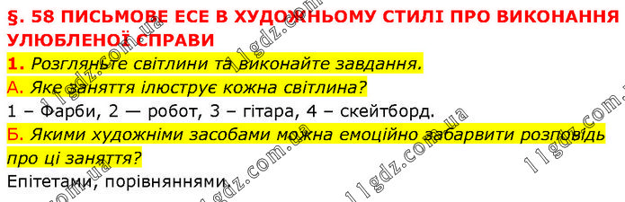 §. 58 ПИСЬМОВЕ ЕСЕ В ХУДОЖНЬОМУ СТИЛІ ПРО ВИКОНАННЯ УЛЮБЛЕНОЇ СПРАВИ 1. Розгляньте світлини та виконайте завдання. А. Яке заняття ілюструє кожна світлина? 1 – Фарби, 2 — робот, 3 – гітара, 4 – скейтборд. Б. Якими художніми засобами можна емоційно забарвити розповідь про ці заняття? Епітетами, порівняннями.