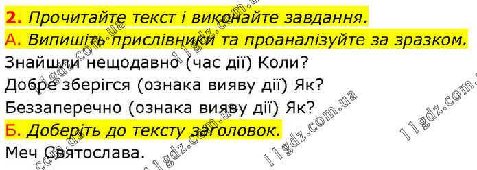 Прочитайте текст і виконайте завдання. А. Випишіть прислівники та проаналізуйте за зразком. Знайшли нещодавно (час дії) Коли? Добре зберігся (ознака вияву дії) Як? Беззаперечно (ознака вияву дії) Як? Б. Доберіть до тексту заголовок. Меч Святослава.