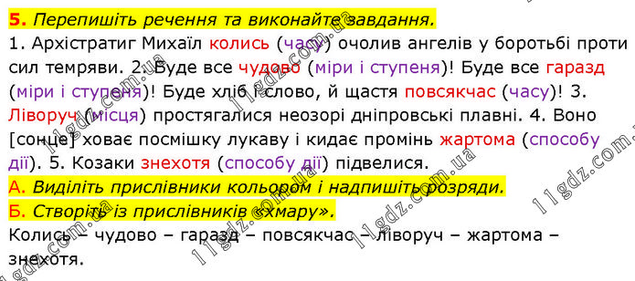 Перепишіть речення та виконайте завдання. 1. Архістратиг Михаїл колись (часу) очолив ангелів у боротьбі проти сил темряви. 2. Буде все чудово (міри і ступеня)! Буде все гаразд (міри і ступеня)! Буде хліб і слово, й щастя повсякчас (часу)! 3. Ліворуч (місця) простягалися неозорі дніпровські плавні. 4. Воно [сонце] ховає посмішку лукаву і кидає промінь жартома (способу дії). 5. Козаки знехотя (способу дії) підвелися. А. Виділіть прислівники кольором і надпишіть розряди. Б. Створіть із прислівників «хмару». Колись – чудово – гаразд – повсякчас – ліворуч – жартома – знехотя.