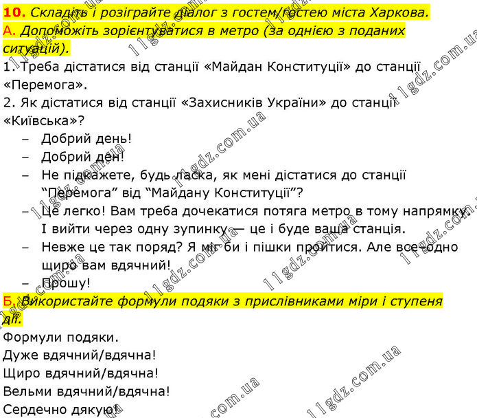 Складіть і розіграйте діалог з гостем/гостею міста Харкова. А. Допоможіть зорієнтуватися в метро (за однією з поданих ситуацій). 1. Треба дістатися від станції «Майдан Конституції» до станції «Перемога». 2. Як дістатися від станції «Захисників України» до станції «Київська»? – Добрий день! – Добрий ден! – Не підкажете, будь ласка, як мені дістатися до станції “Перемога” від “Майдану Конституції”? – Це легко! Вам треба дочекатися потяга метро в тому напрямку. І вийти через одну зупинку — це і буде ваша станція. – Невже це так поряд? Я міг би і пішки пройтися. Але все–одно щиро вам вдячний! – Прошу! Б. Використайте формули подяки з прислівниками міри і ступеня дії. Формули подяки. Дуже вдячний/вдячна! Щиро вдячний/вдячна! Вельми вдячний/вдячна! Сердечно дякую!