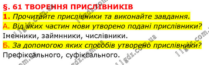 §. 61 ТВОРЕННЯ ПРИСЛІВНИКІВ 1. Прочитайте прислівники та виконайте завдання. А. Від яких частин мови утворено подані прислівники? Іменники, займнники, числівники. Б. За допомогою яких способів утворено прислівники? Префіксального, суфіксального.