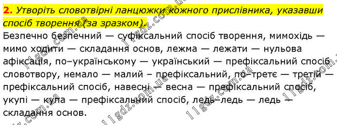 Утворіть словотвірні ланцюжки кожного прислівника, указавши спосіб творення (за зразком). Безпечно безпечний — суфіксальний спосіб творення, мимохідь — мимо ходити — складання основ, лежма — лежати — нульова афіксація, по–українському — український — префіксальний спосіб словотвору, немало — малий – префіксальний, по–третє — третій — префіксальний спосіб, навесні — весна — префіксальний спосіб, укупі — купа — префіксальний спосіб, ледь–ледь — ледь — складання основ.