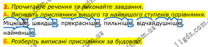 Прочитайте речення та виконайте завдання. А. Випишіть прислівники вищого та найвищого ступенів порівняння. Міцніше, швидше, прекрасніше, пильніше, відчайдушніше, найменше. Б. Розберіть виписані прислівники за будовою.