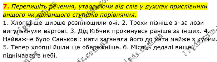 Перепишіть речення, утворюючи від слів у дужках прислівники вищого чи найвищого ступенів порівняння. 1. Хлопці ще ширше розплющили очі. 2. Трохи пізніше з–за лози вигулькнули вартові. 3. Дід Кібчик прокинувся раніше за інших. 4. Найважче було Санькові: мати заганяла його до хати майже з курми. 5. Тепер хлопці йшли ще обережніше. 6. Місяць дедалі вище піднімався в небі.