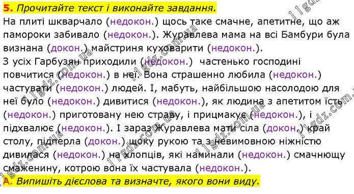 Прочитайте текст і виконайте завдання. На плиті шкварчало (недокон.) щось таке смачне, апетитне, що аж памороки забивало (недокон.). Журавлева мама на всі Бамбури була визнана (докон.) майстриня куховарити (недокон.). З усіх Гарбузян приходили (недокон.) частенько господині повчитися (недокон.) в неї. Вона страшенно любила (недокон.) частувати (недокон.) людей. І, мабуть, найбільшою насолодою для неї було (недокон.) дивитися (недокон.), як людина з апетитом їсть (недокон.) приготовану нею страву, і прицмакує (недокон.), і підхвалює (недокон.). І зараз Журавлева мати сіла (докон.) край столу, підперла (докон.) щоку рукою та з невимовною ніжністю дивилася (недокон.) на хлопців, які наминали (недокон.) смачнющу смаженину, котрою вона їх частувала (недокон.). А. Випишіть дієслова та визначте, якого вони виду.