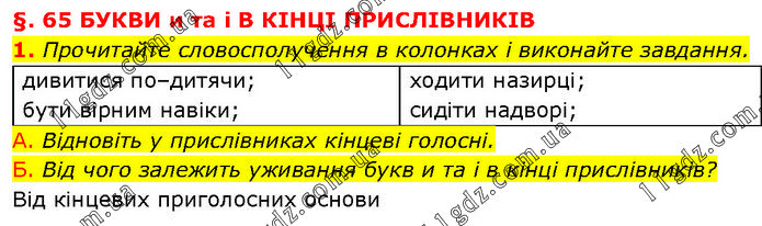 §. 65 БУКВИ и та і В КІНЦІ ПРИСЛІВНИКІВ 1. Прочитайте словосполучення в колонках і виконайте завдання. дивитися по–дитячи; бути вірним навіки; ходити назирці; сидіти надворі; А. Відновіть у прислівниках кінцеві голосні. Б. Від чого залежить уживання букв и та і в кінці прислівників? Від кінцевих приголосних основи