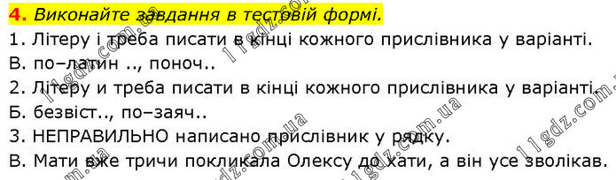 Виконайте завдання в тестовій формі. 1. Літеру і треба писати в кінці кожного прислівника у варіанті. В. по–латин .., поноч.. 2. Літеру и треба писати в кінці кожного прислівника у варіанті. Б. безвіст.., по–заяч.. 3. НЕПРАВИЛЬНО написано прислівник у рядку. В. Мати вже тричи покликала Олексу до хати, а він усе зволікав.