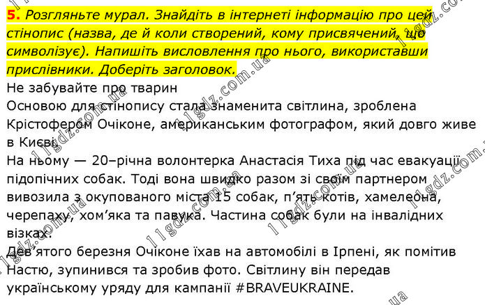 Розгляньте мурал. Знайдіть в інтернеті інформацію про цей стінопис (назва, де й коли створений, кому присвячений, що символізує). Напишіть висловлення про нього, використавши прислівники. Доберіть заголовок. Не забувайте про тварин Основою для стінопису стала знаменита світлина, зроблена Крістофером Очіконе, американським фотографом, який довго живе в Києві. На ньому — 20–річна волонтерка Анастасія Тиха під час евакуації підопічних собак. Тоді вона швидко разом зі своїм партнером вивозила з окупованого міста 15 собак, п’ять котів, хамелеона, черепаху, хом’яка та павука. Частина собак були на інвалідних візках. Дев’ятого березня Очіконе їхав на автомобілі в Ірпені, як помітив Настю, зупинився та зробив фото. Світлину він передав українському уряду для кампанії #BRAVEUKRAINE.