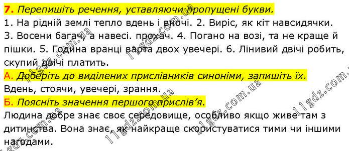 Перепишіть речення, уставляючи пропущені букви. 1. На рідній землі тепло вдень і вночі. 2. Виріс, як кіт навсидячки. 3. Восени багач, а навесі. прохач. 4. Погано на возі, та не краще й пішки. 5. Година вранці варта двох увечері. 6. Лінивий двічі робить, скупий двічі платить. А. Доберіть до виділених прислівників синоніми, запишіть їх. Вдень, стоячи, увечері, зрання. Б. Поясніть значення першого прислів’я. Людина добре знає своє середовище, особливо якщо живе там з дитинства. Вона знає, як найкраще скористуватися тими чи іншими нагодами.