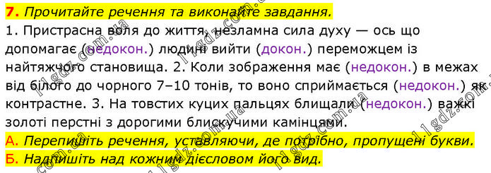 Прочитайте речення та виконайте завдання. 1. Пристрасна воля до життя, незламна сила духу — ось що допомагає (недокон.) людині вийти (докон.) переможцем із найтяжчого становища. 2. Коли зображення має (недокон.) в межах від білого до чорного 7–10 тонів, то воно сприймається (недокон.) як контрастне. 3. На товстих куцих пальцях блищали (недокон.) важкі золоті перстні з дорогими блискучими камінцями. А. Перепишіть речення, уставляючи, де потрібно, пропущені букви. Б. Надпишіть над кожним дієсловом його вид.
