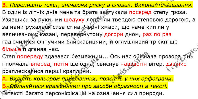 Перепишіть текст, знімаючи риску в словах. Виконайте завдання. В один із літніх днів мене та брата застукала посеред степу гроза. Узявшись за руки, ми щодуху лопотіли твердою степовою дорогою, а за нами рухалася сиза стіна. Чорні хмари, що наче кипіли у величезному казані, перевернутому догори дном, раз по раз гадючилися сліпучими блискавицями, й оглушливий тріскіт ще більше підганяв нас. Степ попереду здавався безмежним... Ось нас обігнала прозора тінь і помчала вперед, потім ще одна, свиснув навздогін вітер, дзвінко розплескалися перші краплини. А. Виділіть кольором прислівники, поясніть у них орфограми. Б. Обміняйтеся враженнями про засоби образності в тексті. В тексті багато персоніфікацій на означення сил природи.