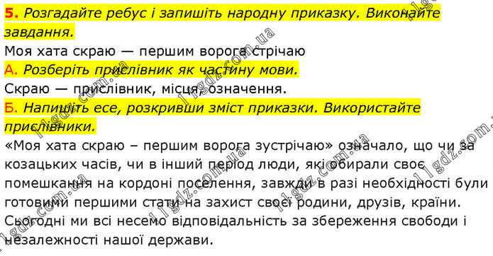 Розгадайте ребус і запишіть народну приказку. Виконайте завдання. Моя хата скраю — першим ворога стрічаю. А. Розберіть прислівник як частину мови. Скраю — прислівник, місця, означення. Б. Напишіть есе, розкривши зміст приказки. Використайте прислівники. «Моя хата скраю – першим ворога зустрічаю» означало, що чи за козацьких часів, чи в інший період люди, які обирали своє помешкання на кордоні поселення, завжди в разі необхідності були готовими першими стати на захист своєї родини, друзів, країни. Сьогодні ми всі несемо відповідальність за збереження свободи і незалежності нашої держави.