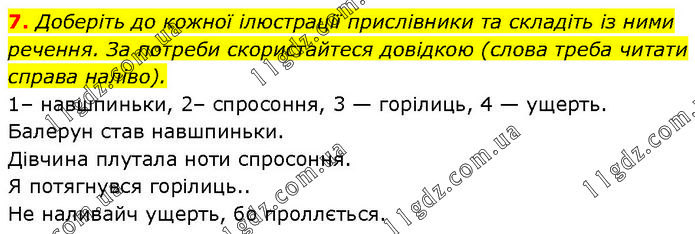 Доберіть до кожної ілюстрації прислівники та складіть із ними речення. За потреби скористайтеся довідкою (слова треба читати справа наліво). 1– навшпиньки, 2– спросоння, 3 — горілиць, 4 — ущерть. Балерун став навшпиньки. Дівчина плутала ноти спросоння. Я потягнувся горілиць. Не наливай ущерть, бо пролиється.