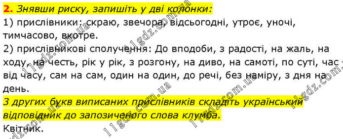 Знявши риску, запишіть у дві колонки: 1) прислівники: скраю, звечора, відсьогодні, утроє, уночі, тимчасово, вкотре. 2) прислівникові сполучення: До вподоби, з радості, на жаль, на ходу, на честь, рік у рік, з розгону, на диво, на самоті, по суті, час від часу, сам на сам, один на один, до речі, без наміру, з дня на день. 3 других букв виписаних прислівників складіть український відповідник до запозиченого слова клумба. Квітник.