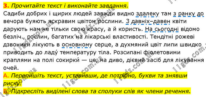 Прочитайте текст і виконайте завдання. Садиби добрих і щирих людей завжди видно здалеку там з ранку до вечора буяють яскравим цвітом рослини. 3 давніх–давен квіти дарують нам не тільки свою красу, а й користь. На сьогодні відомо безліч., рослин, багатих на лікарські властивості. Тендітні рожеві дзвоники лікують в основному серце, а духмяний цвіт липи швидко приводить до ладу́ температуру тіла. Розсипані фіолетовими краплями на полі сокирки́ — це, на диво, дієвий засіб для лікування очей. А. Перепишіть текст, уставивши, де потрібно, букви та знявши риску. Б. Підкресліть виділені слова та сполуки слів як члени речення.