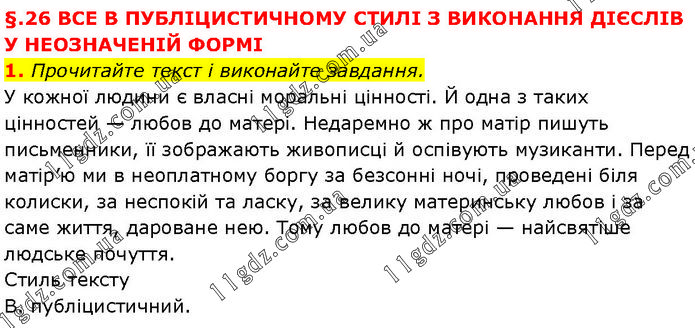 §.26 ВСЕ В ПУБЛІЦИСТИЧНОМУ СТИЛІ З ВИКОНАННЯ ДІЄСЛІВ У НЕОЗНАЧЕНІЙ ФОРМІ 1. Прочитайте текст і виконайте завдання. У кожної людини є власні моральні цінності. Й одна з таких цінностей — любов до матері. Недаремно ж про матір пишуть письменники, її зображають живописці й оспівують музиканти. Перед матір’ю ми в неоплатному боргу за безсонні ночі, проведені біля колиски, за неспокій та ласку, за велику материнську любов і за саме життя, дароване нею. Тому любов до матері — найсвятіше людське почуття. Стиль тексту В. публіцистичний.