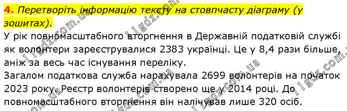 Перетворіть інформацію тексту на стовпчасту діаграму (у зошитах). У рік повномасштабного вторгнення в Державній податковій службі як волонтери зареєструвалися 2383 українці. Це у 8,4 рази більше, аніж за весь час існування переліку. Загалом податкова служба нарахувала 2699 волонтерів на початок 2023 року. Реєстр волонтерів створено ще у 2014 році. До повномасштабного вторгнення він налічував лише 320 осіб.