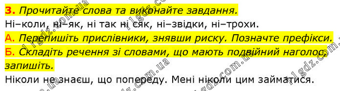 Прочитайте слова та виконайте завдання. Ні–коли, ні–як, ні так ні сяк, ні–звідки, ні–трохи. А. Перепишіть прислівники, знявши риску. Позначте префікси. Б. Складіть речення зі словами, що мають подвійний наголос, запишіть. Ніколи не знаєш, що попереду. Мені ніколи цим займатися.