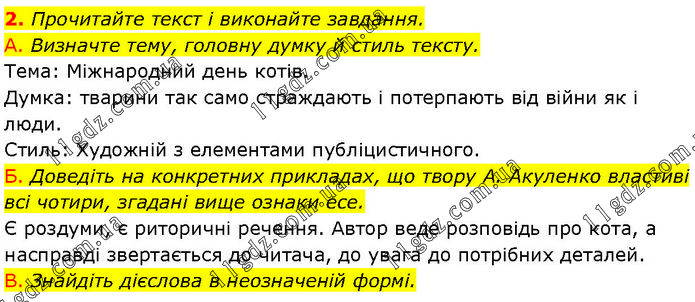 Прочитайте текст і виконайте завдання. A. Визначте тему, головну думку й стиль тексту. Тема: Міжнародний день котів. Думка: тварини так само страждають і потерпають від війни як і люди. Стиль: Художній з елементами публіцистичного. Б. Доведіть на конкретних прикладах, що твору А. Акуленко властиві всі чотири, згадані вище ознаки есе. Є роздуми, є риторичні речення. Автор веде розповідь про кота, а насправді звертається до читача, до увага до потрібних деталей. B. Знайдіть дієслова в неозначеній формі.