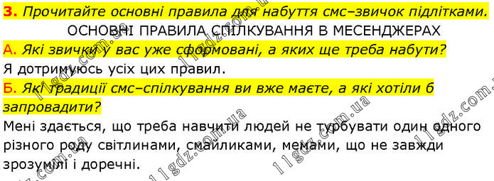 Прочитайте основні правила для набуття смс–звичок підлітками. ОСНОВНІ ПРАВИЛА СПІЛКУВАННЯ В МЕСЕНДЖЕРАХ А. Які звички у вас уже сформовані, а яких ще треба набути? Я дотримуюсь усіх цих правил. Б. Які традиції смс–спілкування ви вже маєте, а які хотіли б запровадити? Мені здається, що треба навчити людей не турбувати один одного різного роду світлинами, смайликами, мемами, що не завжди зрозумілі і доречні.