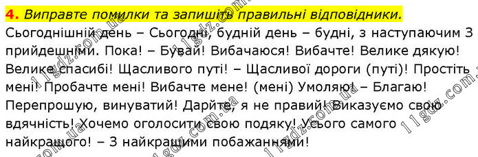 Виправте помилки та запишіть правильні відповідники. Сьогоднішній день – Сьогодні, будній день – будні, з наступаючим З прийдешніми. Пока! – Бувай! Вибачаюся! Вибачте! Велике дякую! Велике спасибі! Щасливого путі! – Щасливої дороги (путі)! Простіть мені! Пробачте мені! Вибачте мене! (мені) Умоляю! – Благаю! Перепрошую, винуватий! Дарйте, я не правий! Виказуємо свою вдячність! Хочемо оголосити свою подяку! Усього самого найкращого! – З найкращими побажаннями!