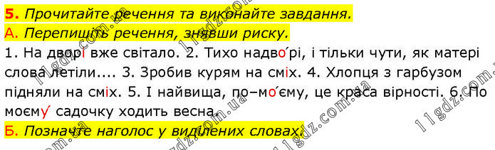 Прочитайте речення та виконайте завдання. А. Перепишіть речення, знявши риску. 1. На дворі вже світало. 2. Тихо надво՛рі, і тільки чути, як матері слова летіли.... 3. Зробив курям на сміх. 4. Хлопця з гарбузом підняли на сміх. 5. І найвища, по–мо՛єму, це краса вірності. 6. По моєму՛ садочку ходить весна. Б. Позначте наголос у виділених словах.