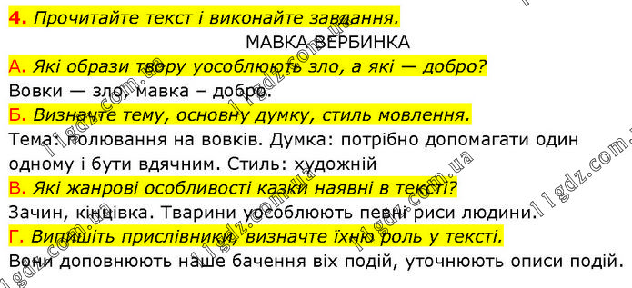 Прочитайте текст і виконайте завдання. МАВКА ВЕРБИНКА A. Які образи твору уособлюють зло, а які — добро? Вовки — зло, мавка – добро. Б. Визначте тему, основну думку, стиль мовлення. Тема: полювання на вовків. Думка: потрібно допомагати один одному і бути вдячним. Стиль: художній. B. Які жанрові особливості казки наявні в тексті? Зачин, кінцівка. Тварини уособлюють певні риси людини. Г. Випишіть прислівники, визначте їхню роль у тексті. Вони доповнюють наше бачення віх подій, уточнюють описи подій.