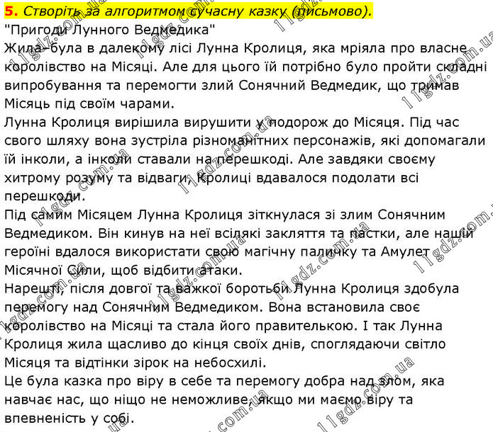 Створіть за алгоритмом сучасну казку (письмово). "Пригоди Лунного Ведмедика" Жила–була в далекому лісі Лунна Кролиця, яка мріяла про власне королівство на Місяці. Але для цього їй потрібно було пройти складні випробування та перемогти злий Сонячний Ведмедик, що тримав Місяць під своїм чарами. Лунна Кролиця вирішила вирушити у подорож до Місяця. Під час свого шляху вона зустріла різноманітних персонажів, які допомагали їй інколи, а інколи ставали на перешкоді. Але завдяки своєму хитрому розуму та відваги, Кролиці вдавалося подолати всі перешкоди. Під самим Місяцем Лунна Кролиця зіткнулася зі злим Сонячним Ведмедиком. Він кинув на неї всілякі закляття та пастки, але нашій героїні вдалося використати свою магічну паличку та Амулет Місячної Сили, щоб відбити атаки. Нарешті, після довгої та важкої боротьби Лунна Кролиця здобула перемогу над Сонячним Ведмедиком. Вона встановила своє королівство на Місяці та стала його правителькою. І так Лунна Кролиця жила щасливо до кінця своїх днів, споглядаючи світло Місяця та відтінки зірок на небосхилі. Це була казка про віру в себе та перемогу добра над злом, яка навчає нас, що ніщо не неможливе, якщо ми маємо віру та впевненість у собі.