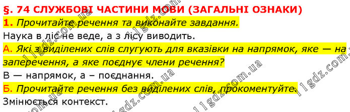 §. 74 СЛУЖБОВІ ЧАСТИНИ МОВИ (ЗАГАЛЬНІ ОЗНАКИ) 1. Прочитайте речення та виконайте завдання. Наука в ліс не веде, а з лісу виводить. А. Які з виділених слів слугують для вказівки на напрямок, яке — на заперечення, а яке поєднує члени речення? В — напрямок, а – поєднання. Б. Прочитайте речення без виділених слів, прокоментуйте. Змінюється контекст.