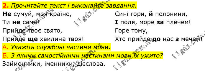 Прочитайте текст і виконайте завдання. Не сумуй, моя країно, Ти не сама! Прийде твоє свято, Прийде ще хвилина твоя! Сині гори, й полонини, І поля, море за плечем! Горе тому, Хто прийде до нас з мечем! А. Укажіть службові частини мови. Б. З якими самостійними частинами мови їх ужито? Займенники, іменники, дієслова.