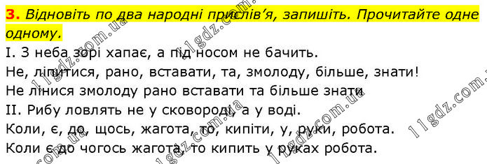 Відновіть по два народні прислів’я, запишіть. Прочитайте одне одному. I. З неба зорі хапає, а під носом не бачить. Не, ліпитися, рано, вставати, та, змолоду, більше, знати! Не лінися змолоду рано вставати та більше знати. II. Рибу ловлять не у сковороді, а у воді. Коли, є, до, щось, жагота, то, кипіти, у, руки, робота. Коли є до чогось жагота, то кипить у руках робота.