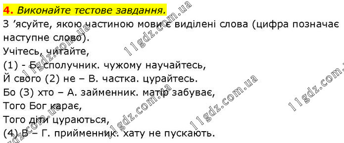 Виконайте тестове завдання. З ’ясуйте, якою частиною мови є виділені слова (цифра позначає наступне слово). Учітесь, читайте, (1) – Б. сполучник. чужому научайтесь, Й свого (2) не – В. частка. цурайтесь. Бо (З) хто – А. займенник. матір забуває, Того Бог карає, Того діти цураються, (4) В – Г. прийменник. хату не пускають.
