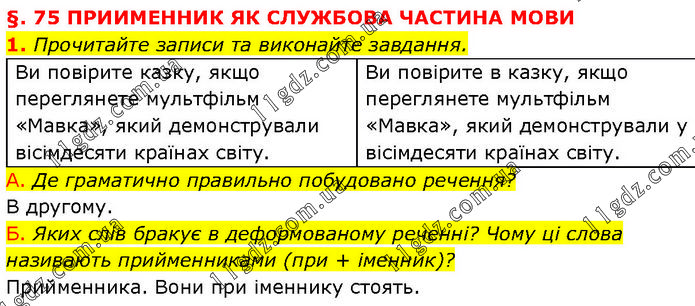 §. 75 ПРИИМЕННИК ЯК СЛУЖБОВА ЧАСТИНА МОВИ 1. Прочитайте записи та виконайте завдання. Ви повірите казку, якщо переглянете мультфільм «Мавка», який демонстрували вісімдесяти країнах світу. Ви повірите в казку, якщо переглянете мультфільм «Мавка», який демонстрували у вісімдесяти країнах світу. А. Де граматично правильно побудовано речення? В другому. Б. Яких слів бракує в деформованому реченні? Чому ці слова називають прийменниками (при + іменник)? Прийменника. Вони при іменнику стоять.