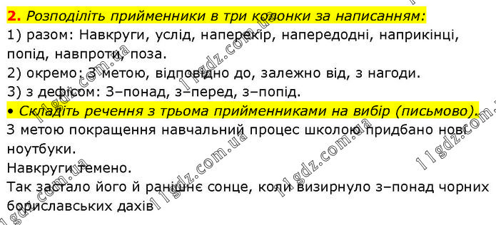 Розподіліть прийменники в три колонки за написанням: 1) разом: Навкруги, услід, наперекір, напередодні, наприкінці, попід, навпроти, поза. 2) окремо: З метою, відповідно до, залежно від, з нагоди. 3) з дефісом: З–понад, з–перед, з–попід. • Складіть речення з трьома прийменниками на вибір (письмово). З метою покращення навчальний процес школою придбано нові ноутбуки. Навкруги темено. Так застало його й ранішнє сонце, коли визирнуло з–понад чорних бориславських дахів.