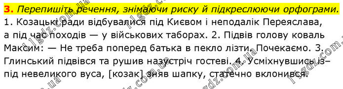 Перепишіть речення, знімаючи риску й підкреслюючи орфограми. 1. Козацькі ради відбувалися під Києвом і неподалік Переяслава, а під час походів — у військових таборах. 2. Підвів голову коваль Максим: — Не треба поперед батька в пекло лізти. Почекаємо. 3. Глинський підвівся та рушив назустріч гостеві. 4. Усміхнувшись із–під невеликого вуса, [козак] зняв шапку, статечно вклонився.