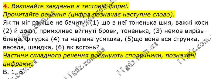 Виконайте завдання в тестовій формі. Прочитайте речення (цифра позначає наступне слово). Як ти міг раніше не бачити, (1) що в неї тоненька шия, важкі коси (2) й довгі, примхливо вигнуті брови, тоненька, (3) немов вирізь–блена, фігурка (4) та чарівна усмішка, (5)що вона вся струнка, весела, швидка, (6) як вогонь? Частини складного речення поєднують сполучники, позначені цифрами. В. 1, 5.