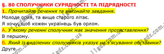 §. 80 СПОЛУЧНИКИ СУРЯДНОСТІ ТА ПІДРЯДНОСТІ 1. Прочитайте речення та виконайте завдання. Молоде орля, та вище старого літає. Я хочу, щоб кожен українець був орлом. А. У якому реченні сполучник має значення протиставлення? В першому. Б. Який із виділених сполучників указує на з’ясування обставини? Друге.