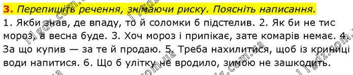 Перепишіть речення, знімаючи риску. Поясніть написання. 1. Якби знав, де впаду, то й соломки б підстелив. 2. Як би не тис мороз, а весна буде. 3. Хоч мороз і припікає, зате комарів немає. 4. За що купив — за те й продаю. 5. Треба нахилитися, щоб із криниці води напитися. 6. Що б улітку не вродило, зимою не зашкодить.