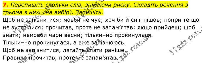 Перепишіть сполуки слів, знімаючи риску. Складіть речення з трьома з них. (на вибір). Запишіть. Щоб не запізнитися; мовби не чує; хоч би й сніг пішов; попри те що не зустрілися; прочитав, проте не запам’ятав; якщо прийдеш; щоб знати; немовби чари весни; тільки–но прокинулася. Тільки–но прокинулася, а вже запізнююсь. Щоб не запізнитися, лягайте спати раніше. Правило прочитав, проте не запам'ятав.