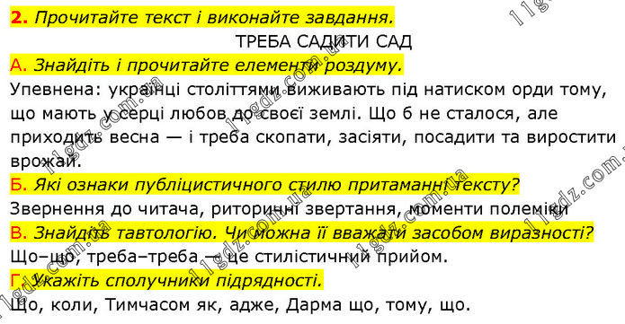 Прочитайте текст і виконайте завдання. ТРЕБА САДИТИ САД A. Знайдіть і прочитайте елементи роздуму. Упевнена: українці століттями виживають під натиском орди тому, що мають у серці любов до своєї землі. Що б не сталося, але приходить весна — і треба скопати, засіяти, посадити та виростити врожай. Б. Які ознаки публіцистичного стилю притаманні тексту? Звернення до читача, риторичні звертання, моменти полеміки. B. Знайдіть тавтологію. Чи можна її вважати засобом виразності? Що–що, треба–треба — це стилістичний прийом. Г. Укажіть сполучники підрядності. Що, коли, Тимчасом як, адже, Дарма що, тому, що.