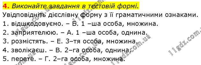 Виконайте завдання в тестовій формі. Увідповідніть дієслівну форму з її граматичними ознаками. 1. відшкодовуємо. – Б. 1 –ша особа, множина. 2. заприятелюю. – А. 1 –ша особа, однина. 3. розмістять. – Е. 3–тя особа, множина. 4. зволікаєш. – В. 2–га особа, однина. 5. перете. – Г. 2–га особа, множина.
