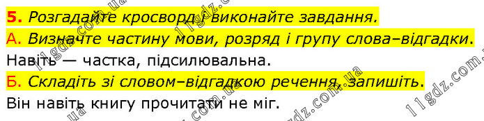 Розгадайте кросворд і виконайте завдання. А. Визначте частину мови, розряд i групу слова–вiдгадки. Навіть — частка, підсилювальна. Б. Складiть зi словом–вiдгадкою речення, запишiть. Він навіть книгу прочитати не міг.