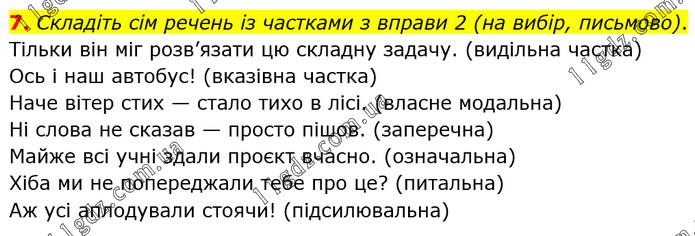 Складіть сім речень із частками з вправи 2 (на вибір, письмово). Тільки він міг розв’язати цю складну задачу. (видільна частка) Ось і наш автобус! (вказівна частка) Наче вітер стих — стало тихо в лісі. (власне модальна) Ні слова не сказав — просто пішов. (заперечна) Майже всі учні здали проєкт вчасно. (означальна) Хіба ми не попереджали тебе про це? (питальна) Аж усі аплодували стоячи! (підсилювальна)