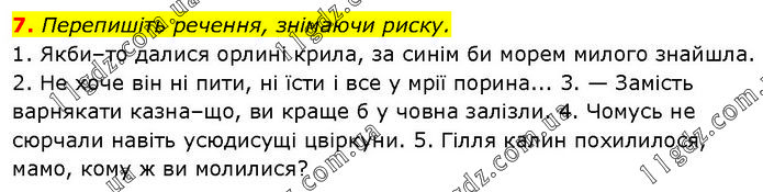 Перепишіть речення, знімаючи риску. 1. Якби–то далися орлині крила, за синім би морем милого знайшла. 2. Не хоче він ні пити, ні їсти і все у мрії порина... 3. — Замість варнякати казна–що, ви краще б у човна залізли. 4. Чомусь не сюрчали навіть усюдисущі цвіркуни. 5. Гілля калин похилилося, мамо, кому ж ви молилися?