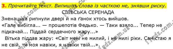 Прочитайте текст. Випишіть слова із часткою не, знявши риску. СІЛЬСЬКА СЕРЕНАДА Зненацька рипнули двері й на ґанок хтось вийшов. «Галя вибігла... — прошепотів Федько. — Таки взяло... Тепер не підкачай... Піддай сердечного жару...» Вітька піддав жару: «Світ мені не милий, і не милі ріки. Сам стаю я не свій, ти моя навіки, я навіки твій...».