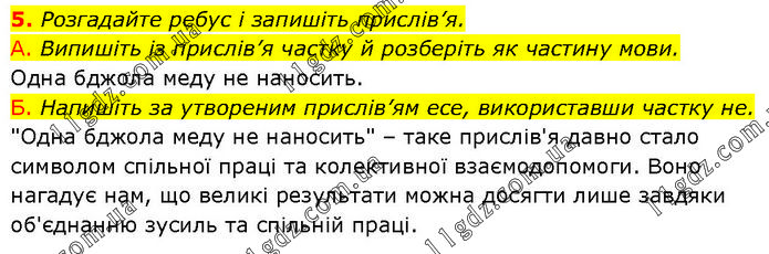 Розгадайте ребус і запишіть прислів’я. А. Випишіть із прислів’я частку й розберіть як частину мови. Одна бджола меду не наносить. Б. Напишіть за утвореним прислів’ям есе, використавши частку не. "Одна бджола меду не наносить" – таке прислів'я давно стало символом спільної праці та колективної взаємодопомоги. Воно нагадує нам, що великі результати можна досягти лише завдяки об'єднанню зусиль та спільній праці.