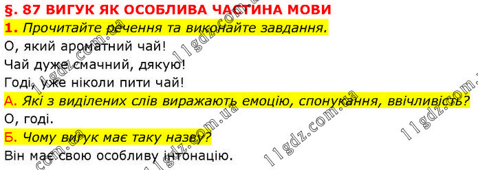 §. 87 ВИГУК ЯК ОСОБЛИВА ЧАСТИНА МОВИ 1. Прочитайте речення та виконайте завдання. О, який ароматний чай! Чай дуже смачний, дякую! Годі, уже ніколи пити чай! А. Які з виділених слів виражають емоцію, спонукання, ввічливість? О, годі. Б. Чому вигук має таку назву? Він має свою особливу інтонацію.