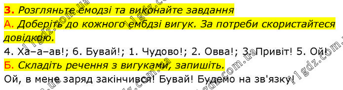 Розгляньте емодзі та виконайте завдання А. Доберіть до кожного ембдзі вигук. За потреби скористайтеся довідкою. 4. Ха–а–ав!; 6. Бувай!; 1. Чудово!; 2. Овва!; 3. Привіт! 5. Ой! Б. Складіть речення з вигуками, запишіть. Ой, в мене заряд закінчився! Бувай! Будемо на зв'язку!