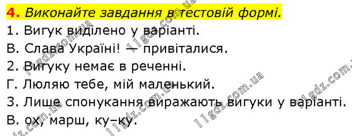 Виконайте завдання в тестовій формі. 1. Вигук виділено у варіанті. В. Слава Україні! — привіталися. 2. Вигуку немає в реченні. Г. Люляю тебе, мій маленький. 3. Лише спонукання виражають вигуки у варіанті. В. ох, марш, ку–ку.